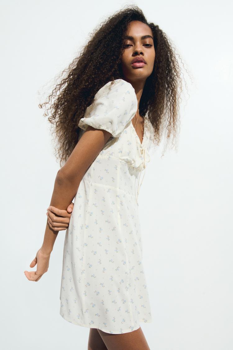 Delicate puffed half sleeves and a flattering fit and flare silhouette highlight this mini dress in soft off-white with subtle dusty rose floral prints. The square neckline is enhanced with charming front ribbons and gentle ruffles on the bodice and sleeves, creating a romantic and classic look. Ideal for spring and summer outings, this dress suits casual brunches, relaxed date nights, and everyday wear, combining feminine detailing with effortless style.