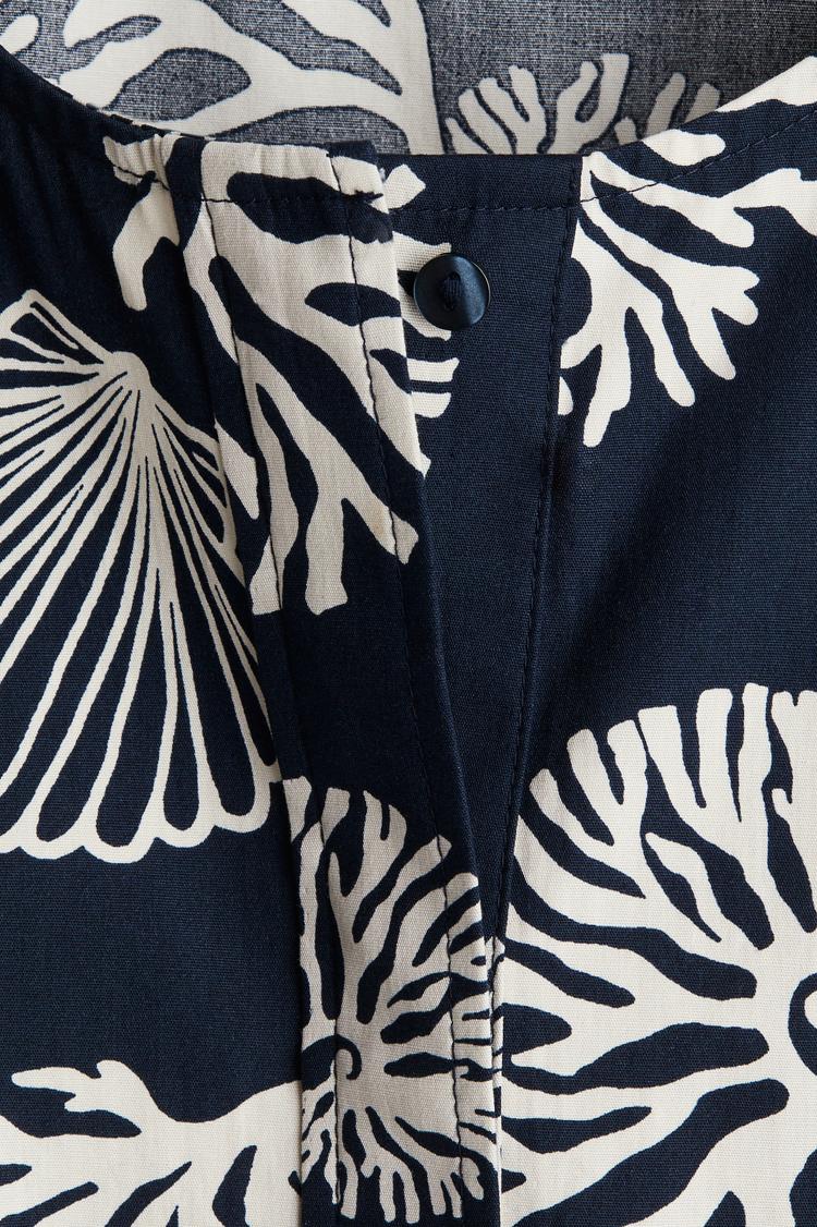 Bold off-white botanical prints on a matte dark blue cotton fabric bring fresh energy to this relaxed-fit shirt dress. The mini length and half puffed sleeves with a classic round neck add a playful yet polished touch. Front buttons and a belt define the waist, making it versatile for casual brunches, vacation outings, or comfortable workwear. This easy-to-style piece offers breathable comfort and timeless appeal for warm spring and summer days.