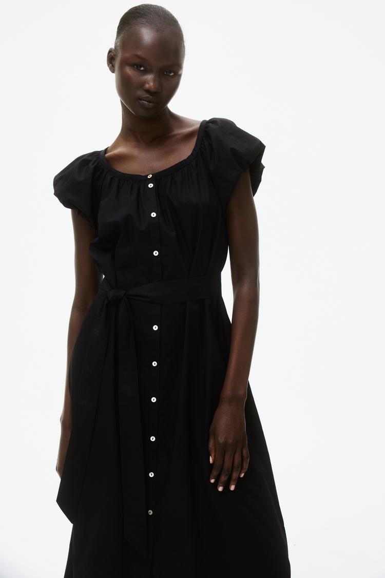 Soft matte black poplin fabric shapes this midi shirt dress with a classic round neckline and puffed short sleeves, offering a timeless silhouette. The button-front closure enhances its casual chic appeal, while the self-tie belt at the waist adds flattering definition. Perfectly suited for spring and summer, this versatile dress transitions effortlessly from relaxed brunches to intimate date nights and everyday casual wear, combining comfort with a polished look.