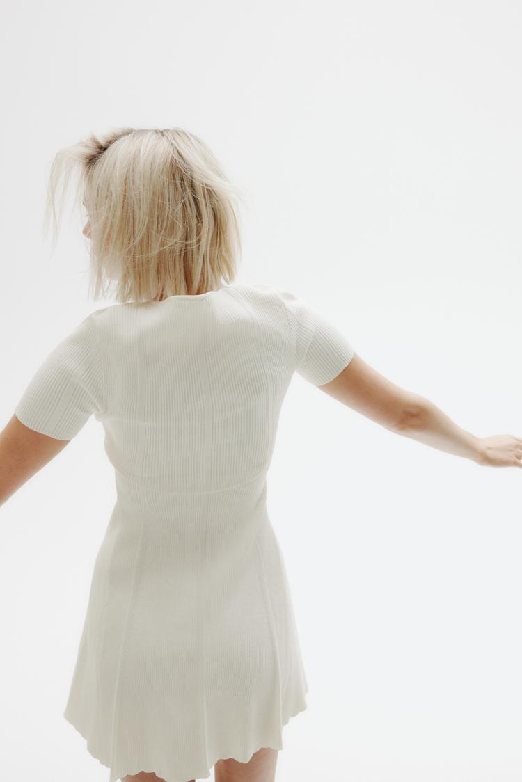 Short dress in an irregular rib knit with a fitted bodice and flared skirt. Round neckline and short sleeves.