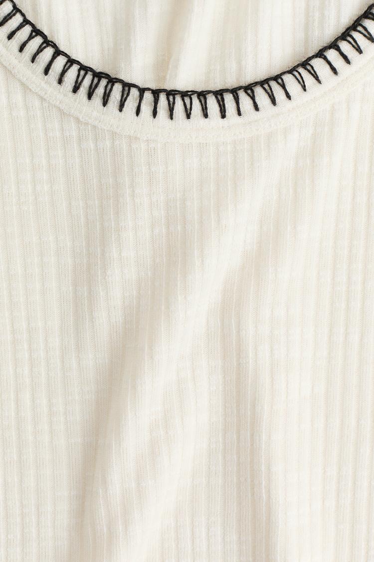 Soft rib-knit cotton fabric shapes a fitted sheath silhouette with a classic round neckline and wide straps, offering a minimalist yet elegant look. The dress features a clean hemline and subtle contrast black stitch detailing along the neckline and armholes, adding refined character. Ideal for spring and summer, it transitions seamlessly from casual daytime outings and brunches to everyday wear with effortless style and comfort.
