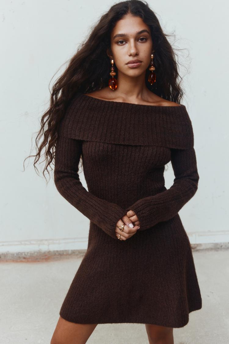 A cozy rib-knit texture and an off-shoulder neckline define this fitted mini sweater dress in a rich matte brown hue. Its long sleeves and clean hemline create a streamlined silhouette perfect for cooler seasons. The casual chic design suits autumn and winter days, making it ideal for brunch outings, casual dates, or relaxed social gatherings. Slip it on for an effortless style that balances warmth with a touch of feminine allure.