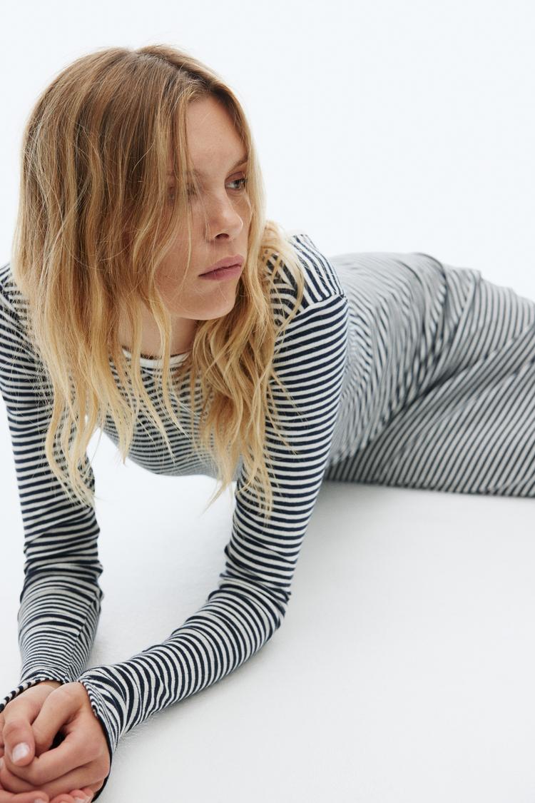 A timeless ribbed knit fabric shapes this mini bodycon dress featuring a flattering scoop neckline and long sleeves for cozy autumn and winter days. The slim fit silhouette is enhanced by classic black and white stripes running all over, creating a minimalist yet chic look perfect for casual outings, everyday wear, or relaxed date nights. Clean hemlines and subtle ribbed texture add understated detail to this versatile piece that pairs effortlessly with boots or sneakers.