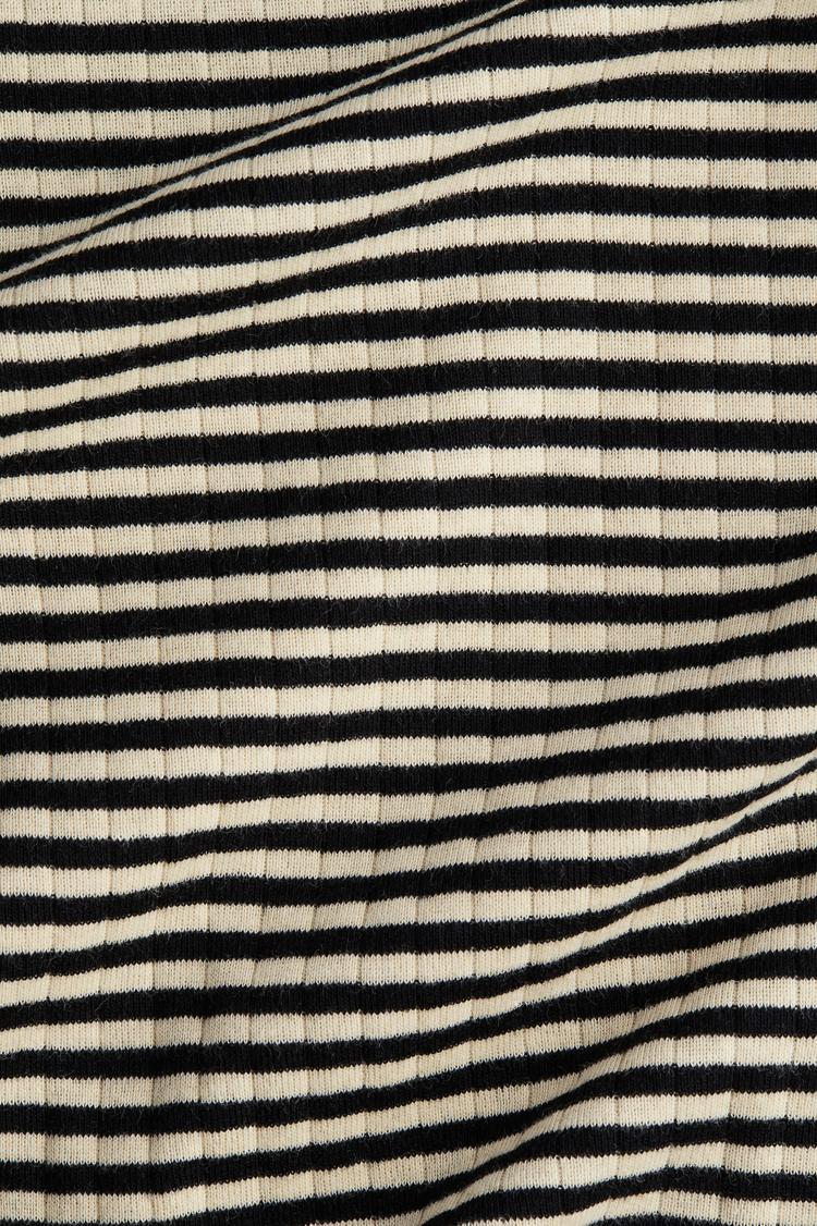 Soft rib knit fabric shapes a fitted sheath dress with a flattering scoop neckline and an open back for a subtle twist. The long sleeves and midi length make this striped dress versatile for autumn and spring days, transitioning easily from casual outings to date nights or workwear settings. A clean hemline and side slit add understated elegance and ease of movement, while the minimalist design highlights the classic black and beige stripe pattern. This dress combines comfort and style with a modern silhouette perfect for multiple occasions.