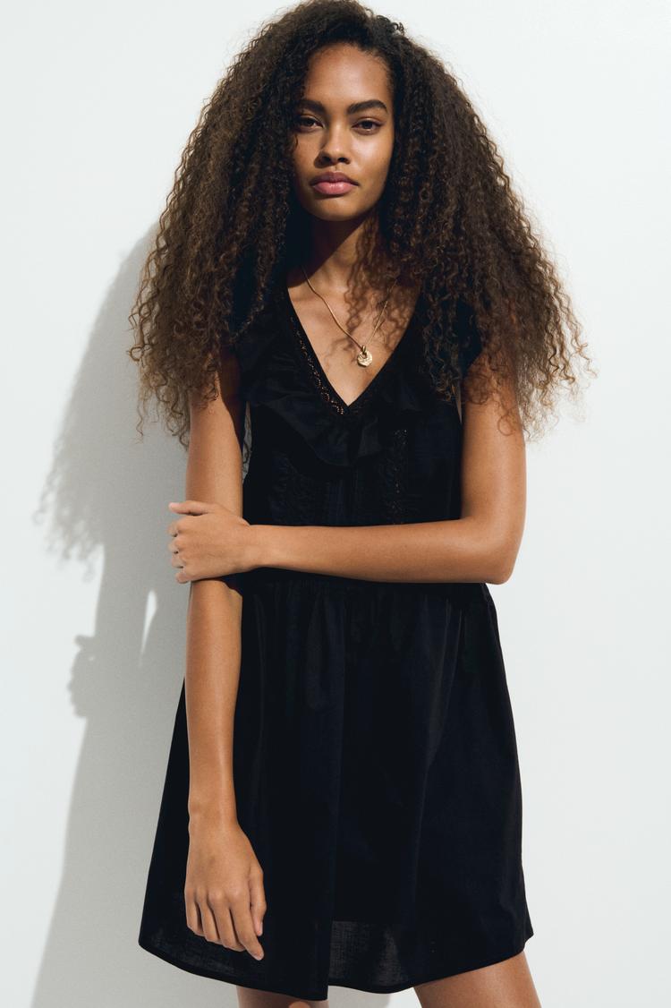 Soft cotton fabric and a flattering A-line silhouette create an effortlessly chic look with this ruffle-trimmed black dress. The sleeveless cut and deep V-neckline enhance its breezy appeal, while delicate ruffle details at the collar and front add subtle texture. Falling above the knee with a clean hemline, this versatile piece is ideal for casual days, brunch outings, or relaxed date nights during warm spring and summer months. Easy to slip on and style, it blends classic comfort with feminine charm for everyday elegance.