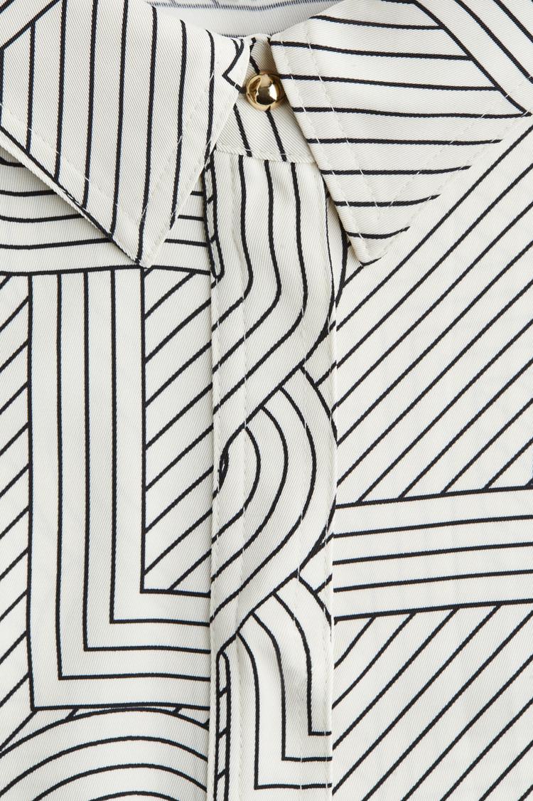 Geometric and striped patterns converge on this off-white shirt dress with a classic collar and three-quarter sleeves. Its relaxed fit and knee-length hem create a versatile silhouette enhanced by a matching belt that defines the waist. The button-down front adds timeless appeal, making it suitable for casual days, workwear, or a stylish brunch outing. Crafted in a minimalist style, this dress balances modern sophistication with everyday comfort, perfect for spring and summer seasons.