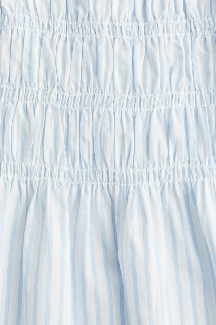 Soft cotton fabric with delicate smocking at the bodice crafts a breezy, comfortable babydoll silhouette. The mini length and sleeveless, strapless design make it perfect for warm spring and summer days. Featuring a straight neckline and subtle light blue and white stripes, this casual chic dress is ideal for everyday wear, brunch outings, or vacation strolls. Effortless to slip on and move in, it blends minimalist style with relaxed comfort for a versatile seasonal staple.