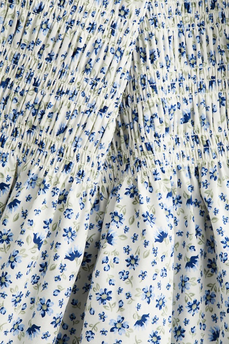 Soft white poplin with delicate blue floral prints and smocked bodice detail creates a charming and airy mini smock dress. The square neckline pairs beautifully with puffed half sleeves and subtle ruffles on the skirt, lending a casual chic vibe perfect for spring and summer outings. Its loose fit offers comfort while maintaining a cute silhouette ideal for brunch dates, casual daywear, or relaxed date nights.