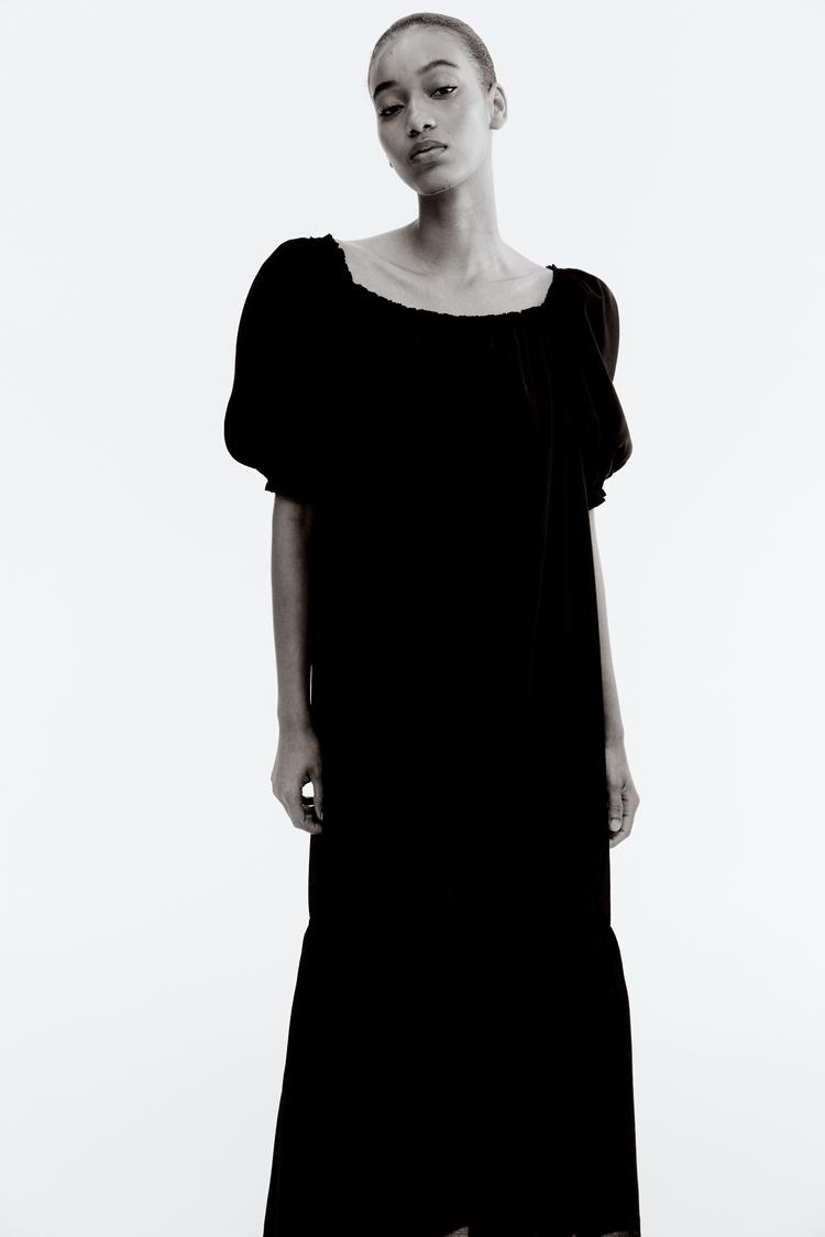 Effortlessly chic in a loose, flowy shift silhouette, this matte black maxi dress features a striking square neckline and voluminous balloon elbow sleeves. The ruffled hem adds subtle movement and a feminine touch, perfect for warm spring and summer days. With its minimalist design and slip-on style, it’s an ideal pick for casual outings, brunch dates, or relaxed evenings. The dress combines comfort and understated elegance, making it a versatile addition to your wardrobe for multiple occasions.