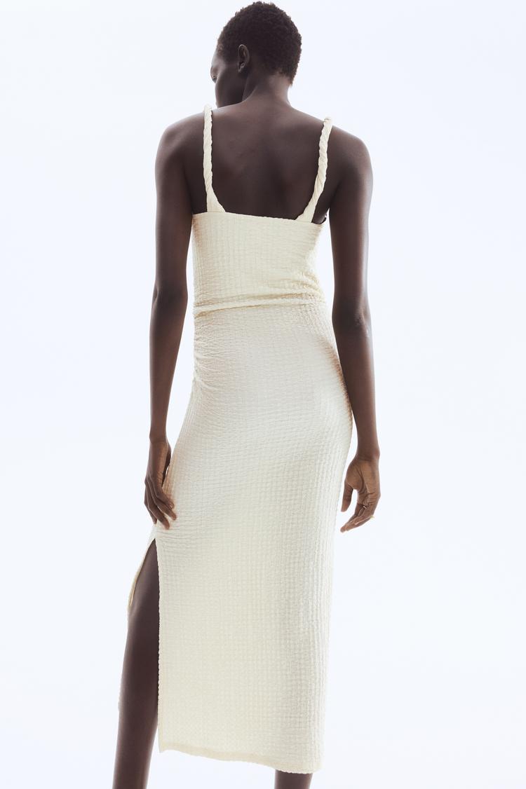 Soft matte off-white jersey fabric and a slim, midi slip dress silhouette create an effortlessly chic look. Featuring a square neckline and wide straps, this dress offers minimalist appeal with subtle ruching details at the front and back enhancing the fit. The sleeveless design and side slit add a touch of modernity and ease. Ideal for spring and summer, this textured jersey dress transitions smoothly from casual brunches to intimate date nights or stylish daytime outings.