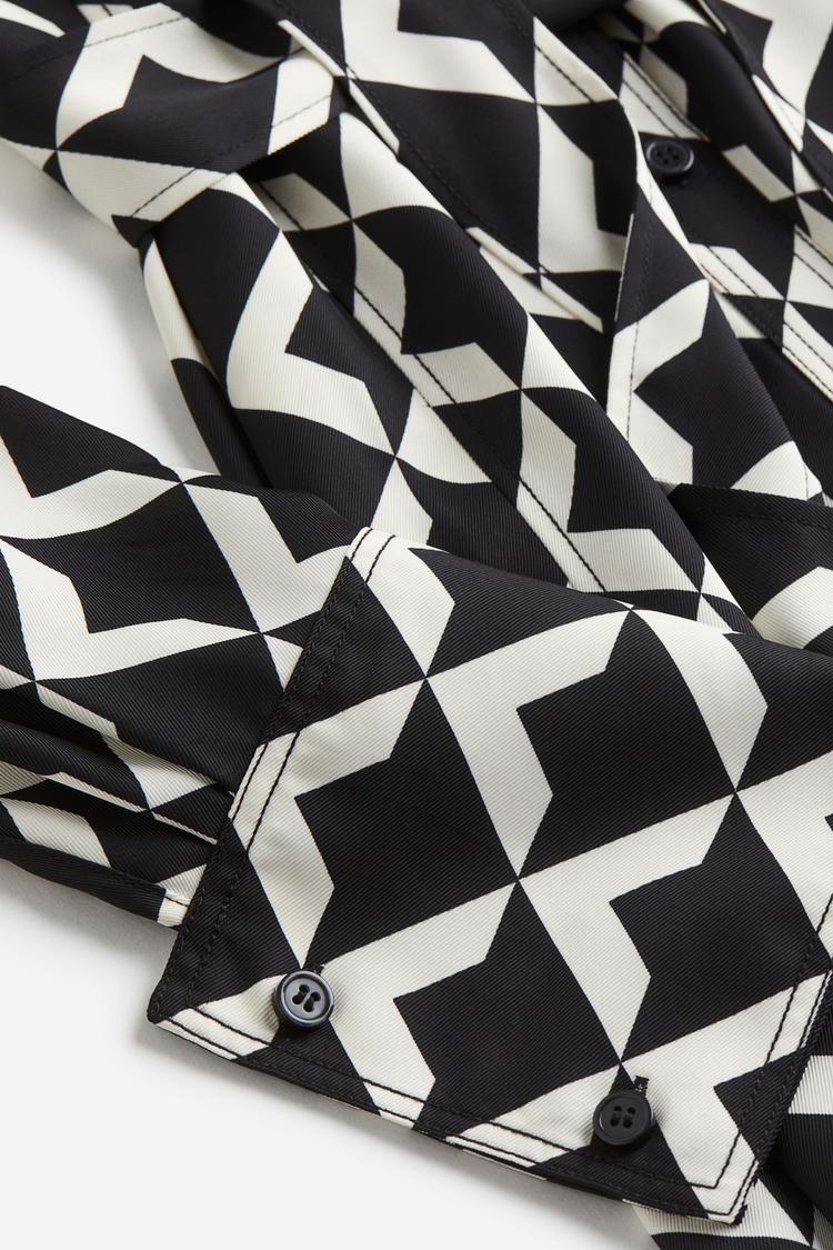 Graphic black and white geometric patterns define this classic shirt dress, crafted from a smooth woven polyester fabric. Its loose, midi-length silhouette features a traditional collar, front buttons, and long sleeves with wide cuffed details. The removable tie belt adds a versatile touch, allowing you to adjust the fit with ease. Perfectly suited for casual days, workwear, or business casual settings, this dress blends minimalist style with practical design elements for all-weather wear.