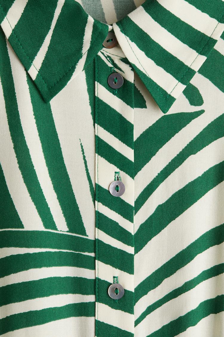 Bold green and white stripes create a fresh, eye-catching pattern on this relaxed-fit midi shirt dress crafted from breathable cotton. Featuring a classic collar, half raglan sleeves, and a clean hemline, the dress balances comfort and style with ruching at the midsection and a removable tie belt to accentuate the waist. Ideal for casual outings, workwear, or a brunch date, this versatile shirt dress transitions effortlessly from day to evening. The front button closure adds a traditional touch, while the elastic at the back waist ensures a flattering fit throughout the day.
