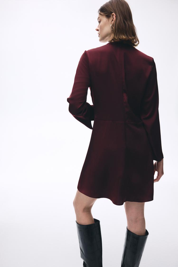 Matte burgundy hues and a refined twist neck detail define this chic shift dress, perfect for elevating your autumn and winter wardrobe. Its long sleeves and mini length create a balanced silhouette that transitions seamlessly from business casual settings to elegant date nights. The clean hemline and regular fit offer timeless sophistication, making it an ideal choice for workwear or stylish evening outings. Crafted for versatile wear, this dress embodies minimalist elegance with a subtle modern edge.