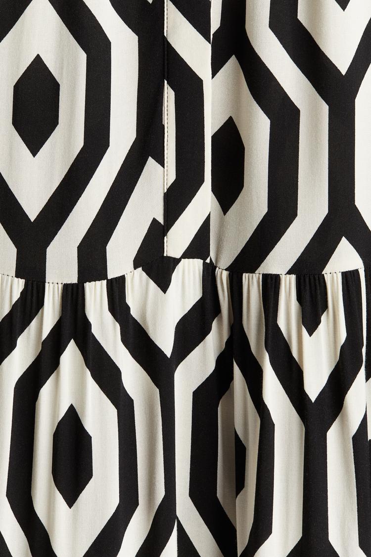 Bold geometric prints and a flowing midi hem define this viscose shirt dress, which features a classic collar and long drop-shoulder sleeves with buttoned cuffs. The gathered seams on the skirt add volume and movement, creating a modern silhouette that drapes loosely for comfort. Ideal for spring and autumn, this versatile piece suits casual outings, workwear, and business casual settings with ease. The concealed button placket keeps the look clean and minimalistic, highlighting the monochrome pattern and ruffled hem for a chic, contemporary vibe.