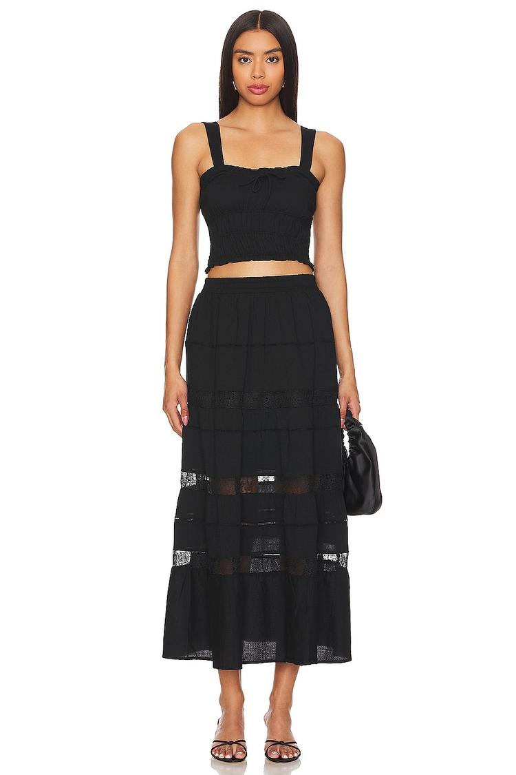 Soft cotton fabric and a relaxed two-piece silhouette combine for a breezy, comfortable look perfect for warm weather. The maxi skirt features tiered layers with sheer panel accents, while the cropped top offers a square neckline and wide straps supported by a smocked back panel for added comfort. Ideal for casual outings, brunch dates, or leisurely spring and summer days, this set’s black hue adds a versatile, chic touch. Its pull-on slip-on styling and partial lining make it an easy, stylish choice for everyday wear or relaxed social occasions.