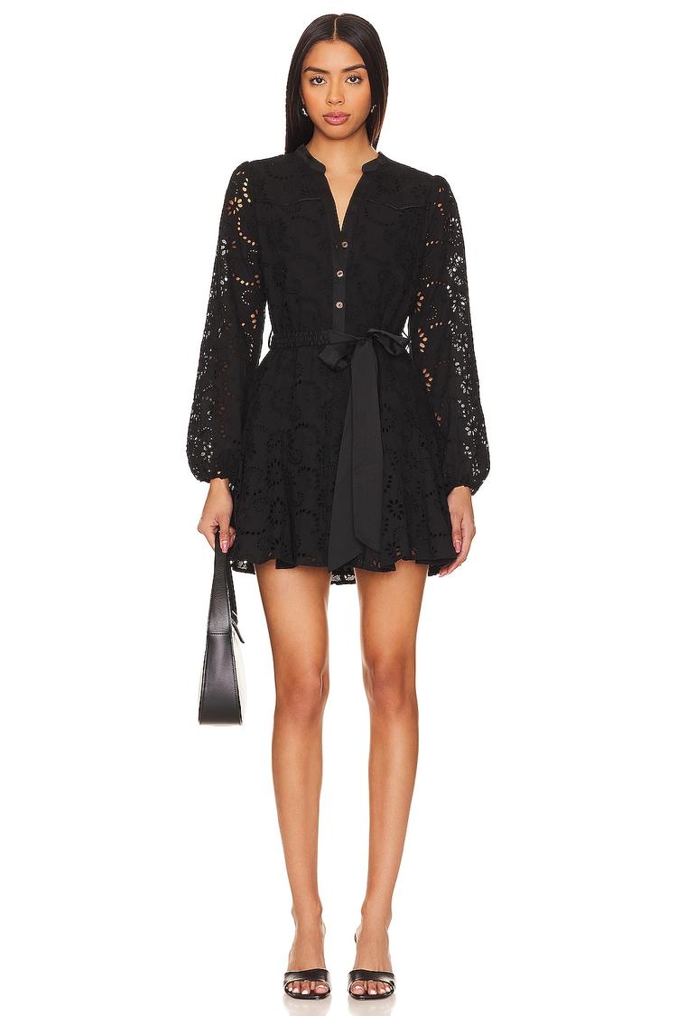 Soft cotton eyelet fabric with intricate embroidery and ruffled hem bring a romantic elegance to this mini shift dress. Featuring a relaxed fit and long puff sleeves with elastic cuffs, it offers comfort and style. The partial front button closure and detachable smocked elastic waist tie create a flattering silhouette. Perfect for spring through autumn, this matte black dress suits brunch, date night, and evening outings with effortless charm.