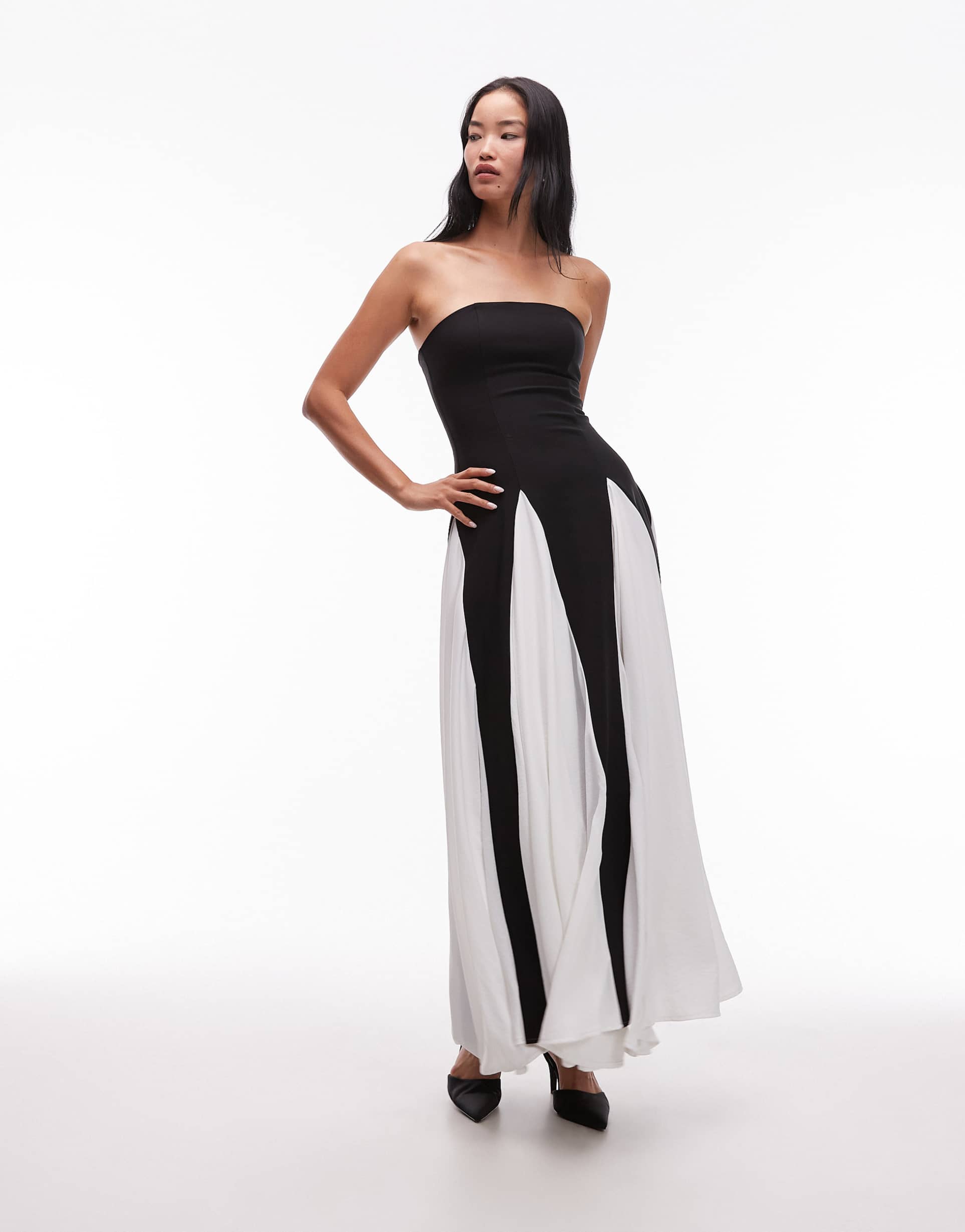 HEIRESS BEVERLY HILLS STRUCTURED BANDEAU CONTRAST GODET PLEATS MAXI DRESS IN BLACK AND WHITE