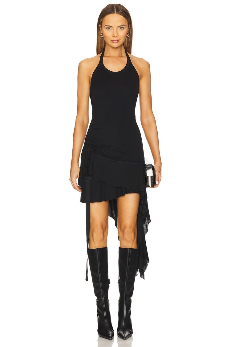 A sleek black slip dress crafted from lightweight jersey fabric blends lyocell and elastane for a body-skimming fit. The halter neck and sleeveless silhouette highlight the shoulders, while adjustable side straps and ruffled asymmetric hem add dynamic style. Perfectly suited for spring and summer evenings, this mini dress transitions effortlessly from cocktail parties to night outs and date nights, embodying minimalist modern elegance with a sexy twist.