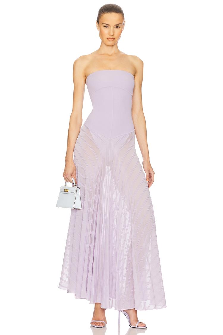 Soft lilac hues blend with a sleek sheath silhouette in this knit bodysuit dress featuring a straight, strapless neckline and a fitted bodice. The maxi length flows into a pleated sheer skirt that adds graceful movement and a touch of allure. Crafted from a viscose-polyester-elastane blend, this dress offers comfort and subtle stretch, ideal for spring and summer evenings. Its minimalist elegance makes it perfect for cocktail parties, date nights, or a sophisticated night out, embodying refined style and easy sophistication.