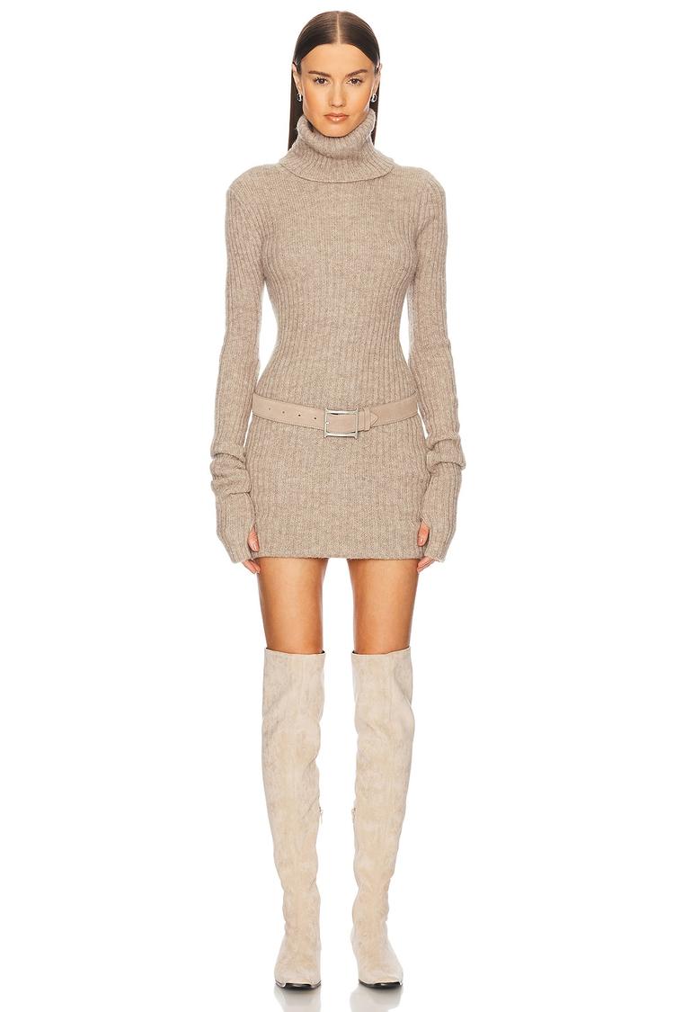 Soft ribbed knit fabric blends polyester, alpaca, and wool to form a fitted mini sweater dress with a chic turtleneck and long sleeves. The clean hemline and thumb-hole accents on the cuffs add subtle style details while maintaining a minimalist vibe. This versatile piece transitions seamlessly through autumn and winter, perfect for casual outings, brunch dates, or relaxed evenings. The slip-on design offers easy wear and comfort, making it an ideal addition to a casual chic wardrobe.