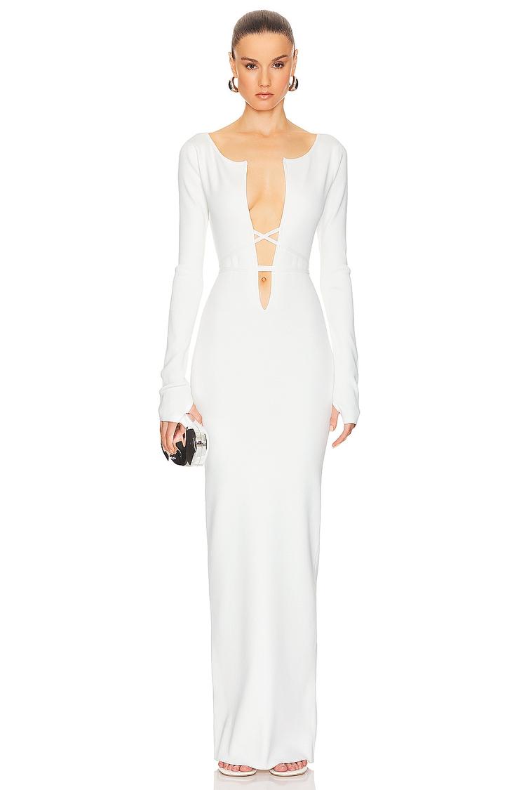 Sleek and sultry, this white maxi sheath dress features a plunging neckline with delicate lace-up and hook-and-eye details that add a captivating touch. Crafted from a midweight slinky ribbed knit blend of viscose, polyester, nylon, and elastane, it offers a bodycon fit that elegantly hugs the silhouette. Long sleeves with thumbhole cut-outs enhance the modern, sophisticated vibe. Ideal for cocktail parties, date nights, and night outs, this versatile dress combines comfort and style with a clean hemline and pull-on convenience.