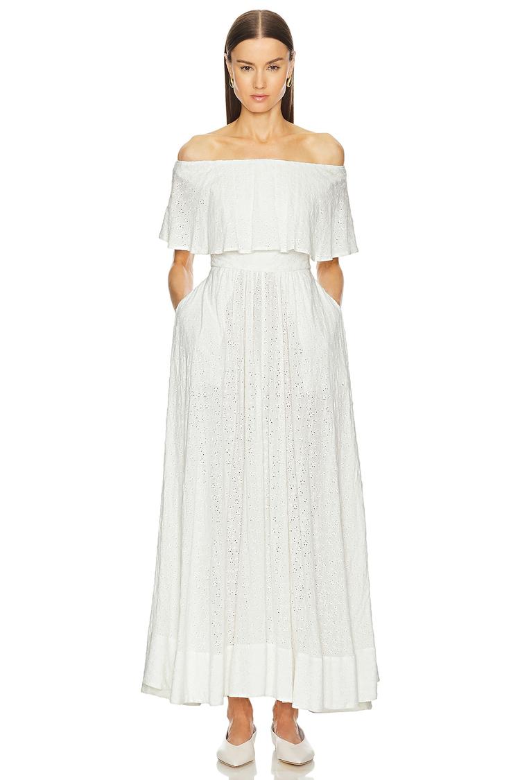 Soft white lace fabric with delicate tiers creates a breezy, romantic vibe in this off-shoulder midi dress. The relaxed shift silhouette skims the petite frame gracefully, while the draped neckline and back tie detail add feminine charm. Functional side pockets and a hidden side zipper enhance wearability. Ideal for spring and summer brunches, vacation days, or outdoor events, this lightweight rayon and cotton blend dress offers both comfort and classic style.