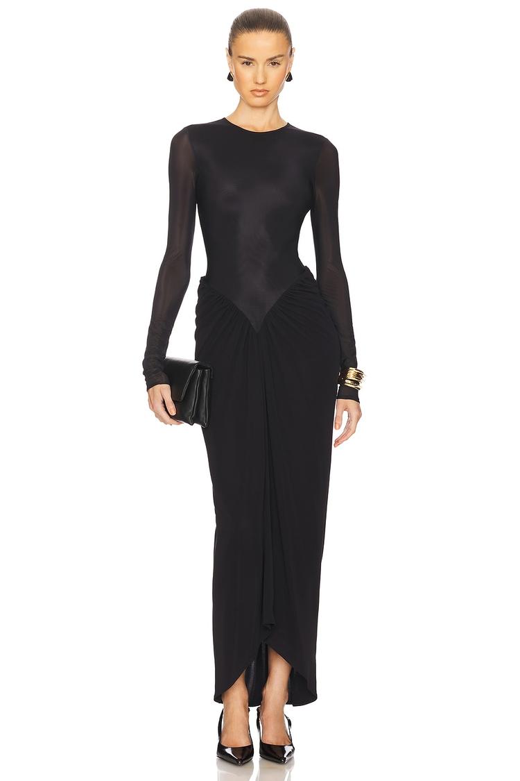 Sleek and sophisticated, this fitted black maxi dress features a crew neckline and long sleeves crafted from a slinky jersey fabric blend of viscose, nylon, and elastane. The high-low hemline and V-waistline add subtle drama to the minimalist silhouette, while a hidden back zipper ensures a smooth finish. Perfect for cocktail parties, date nights, and stylish evenings out, this elegant sheath dress balances modern simplicity with refined details to elevate your special occasion wardrobe.