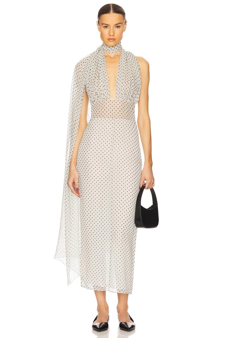 A refined halterneck slip dress crafted from flowing silk chiffon with a delicate black polka dot pattern on an off-white base. The plunging neckline and open back enhance its slim, midi silhouette, while the extended scarf-like fabric adds a dramatic, elegant touch. Lightweight and breathable, this dress is perfect for spring and summer events such as brunches, cocktail parties, and formal weddings. Its hidden side zipper and tie-up closure ensure a sleek fit, making it a sophisticated choice for versatile occasions.