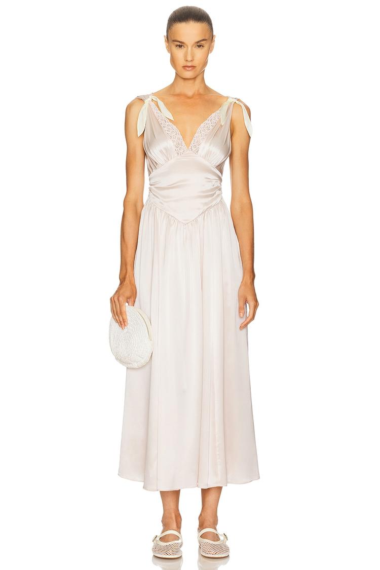 Soft matte off-white silk and delicate lace trim at the neckline combine to create a romantic wrap dress perfect for spring and summer occasions. Featuring a flowing midi length silhouette with wide straps and elegant bow accents at the shoulders, this dress offers a graceful V-neck and an open back design with a hidden side zipper closure. Ideal for cocktail parties, wedding guests, or date nights, its classic and elegant style ensures timeless versatility and refined comfort.