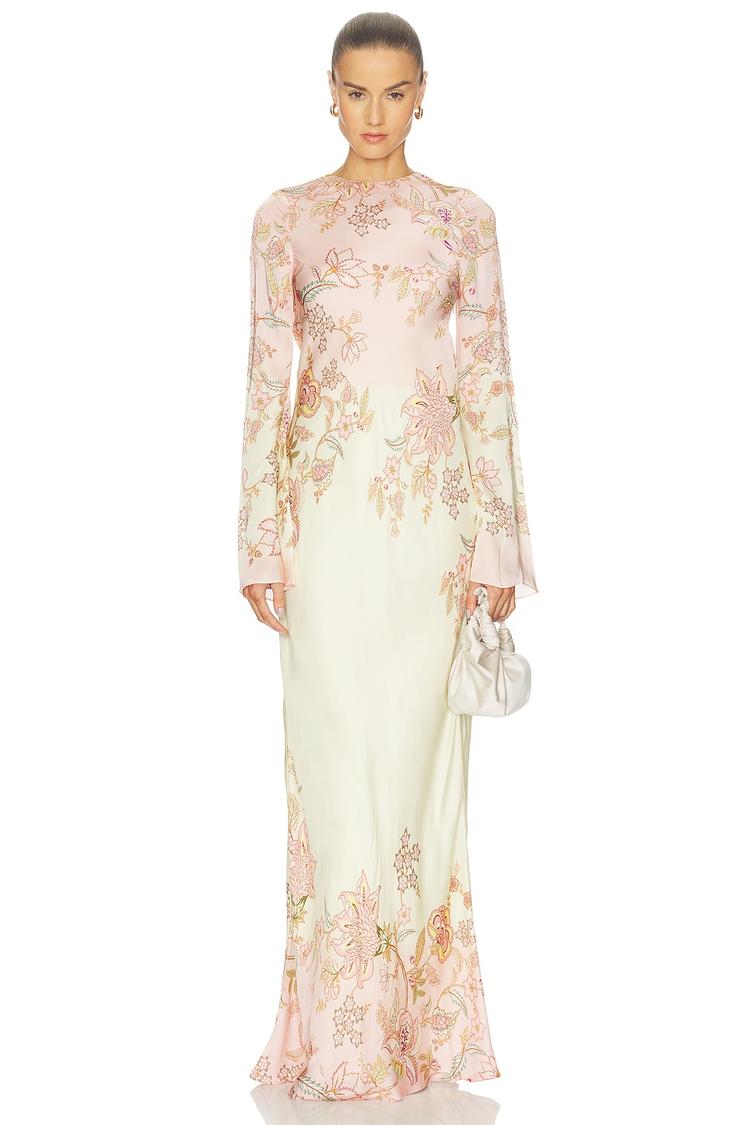 Soft matte ivory viscose with dusty rose floral patterns creates an elegant column silhouette in this maxi dress. The slim fit gently skims the body, complemented by flared long sleeves and a classic round neckline. A key standout feature is the back cutout with a delicate tie-back bow at the nape, adding sophisticated charm. Concealed side zipper closure ensures a smooth finish. Ideal for cocktail parties, formal events, and wedding guests looking for timeless refinement in spring, summer, or autumn.