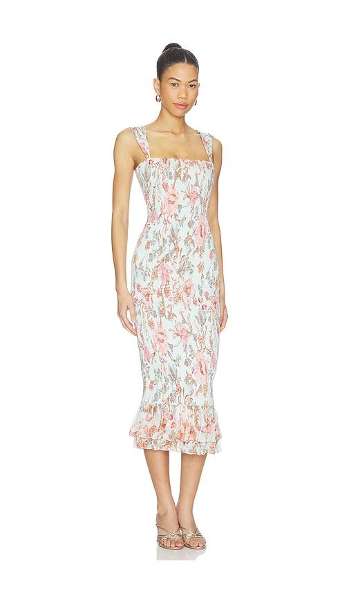 HEMANT AND NANDITA SMOCKED MIDI DRESS IN BLUE.