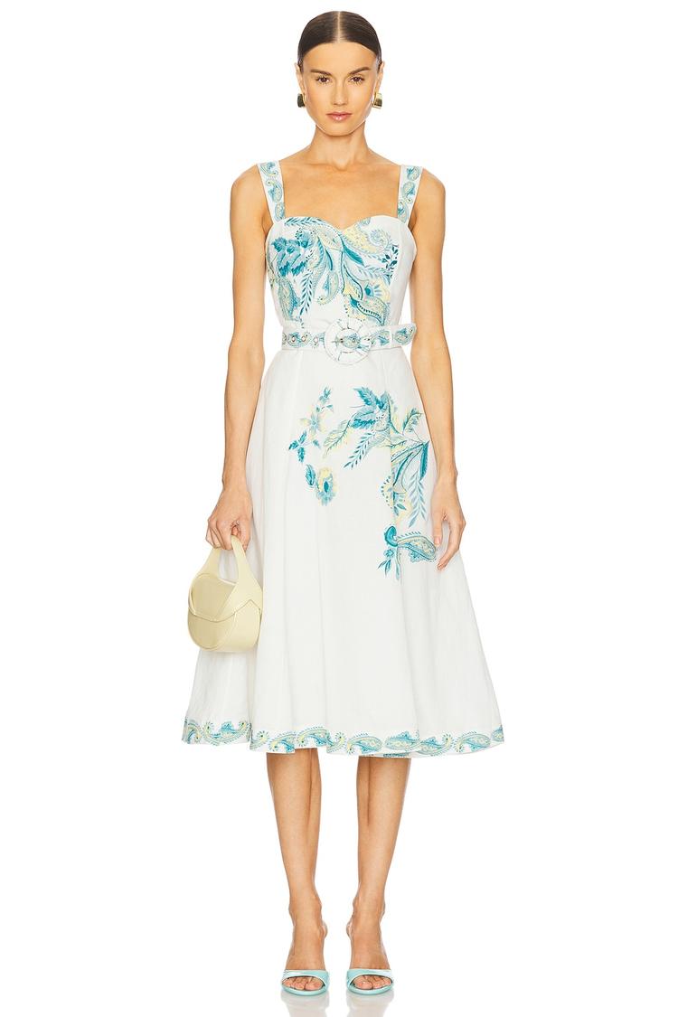 Soft linen and cotton blend fabric with delicate blue floral embroidery adorns this elegant midi dress, featuring a square neckline and wide straps for a flattering fitted silhouette. The detachable buckle belt cinches the waist, enhancing its classic A-line shape, while the concealed back zipper ensures a smooth finish. Perfect for spring and summer occasions, this versatile dress suits brunches, romantic dates, and wedding guest events with ease. The clean hemline and all-over embroidery add refined charm to your warm-weather wardrobe.