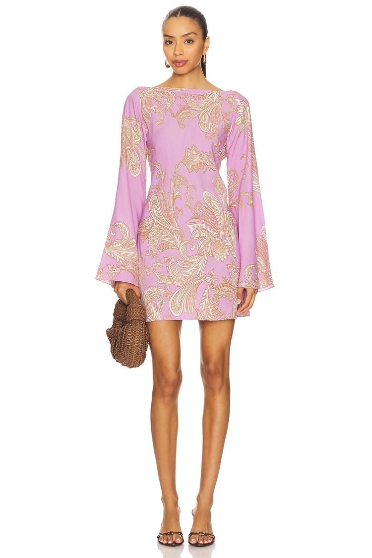 Soft crepe fabric and flared long sleeves define this loose-fitting mini shift dress, adorned with a delicate all-over beige floral print on a matte light pink base. The round neckline and covered back add to its easy pull-on styling, perfect for spring and summer outings. Versatile for casual days, brunches, or romantic date nights, this lightweight viscose dress embodies bohemian charm and casual chic style, combining comfort with effortless elegance.