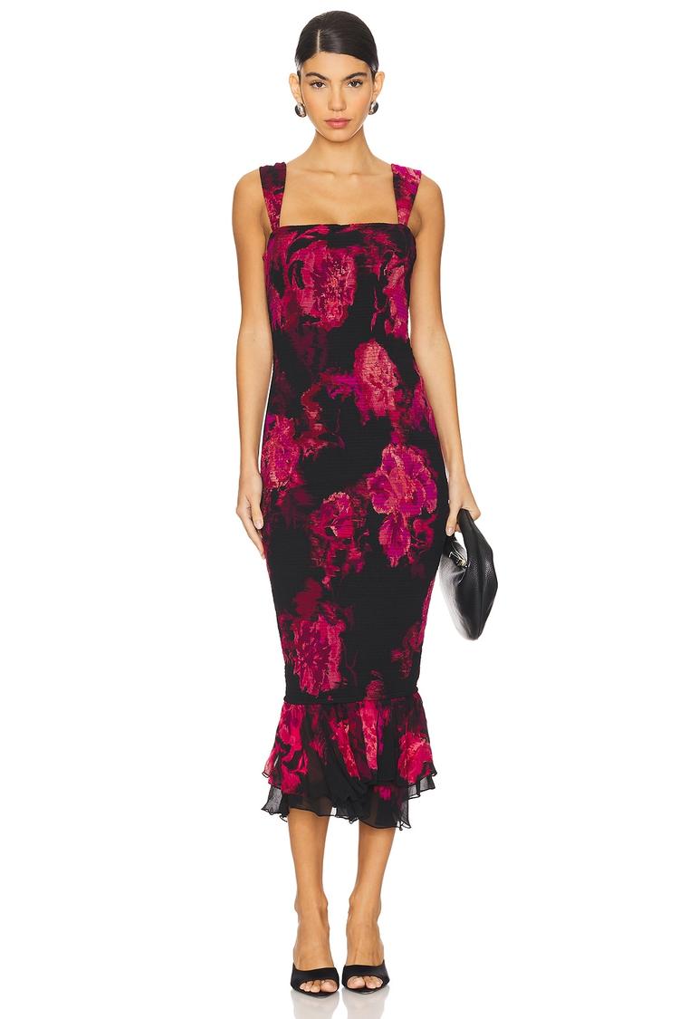 A figure-hugging sheath silhouette defines this smocked midi dress, showcasing a square neckline and wide straps that blend elegance with sophistication. Crafted from viscose and detailed with a striking dark pink floral pattern against a black base, it features a smocked bodice and delicate ruffled chiffon trim at the hem. This fully lined piece offers a comfortable pull-on style, perfect for cocktail parties, date nights, or stylish evenings out, delivering a refined yet flattering look for all seasons.