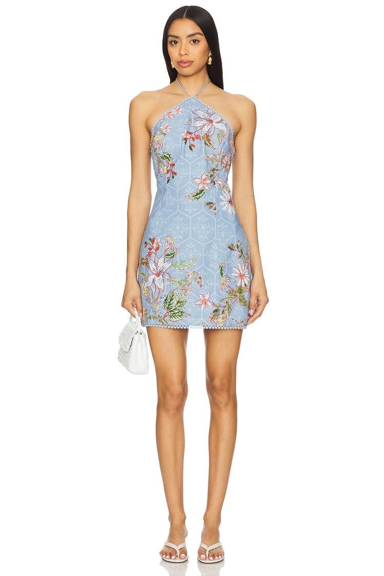 Midweight cotton eyelet fabric and delicate lace trim combine to create a breezy mini shift dress perfect for warm seasons. The halter neck with tie-back closure and sleeveless design offer a flattering, comfortable fit. Floral patterns in soft pinks and greens embellish the matte light blue base, bringing a romantic, bohemian vibe to brunches, date nights, or casual cocktail events. Fully lined for smooth wear, this versatile piece blends casual chic style with effortless elegance for spring and summer wardrobes.