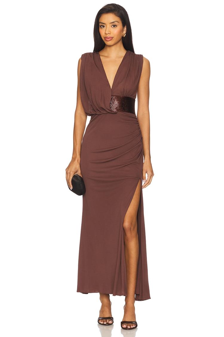 A deep matte brown column gown with a sleek, fitted silhouette and an elegant V-neckline perfect for formal evenings. The sleeveless design showcases shimmering sequin embellishments at the waist and criss-cross back straps, adding a sophisticated sparkle. Crafted from a midweight rayon blend jersey fabric, this maxi gown features an asymmetrical side slit for graceful movement. Ideal for cocktail parties, red carpet events, and upscale formal occasions, this dress combines comfort with refined glamour.