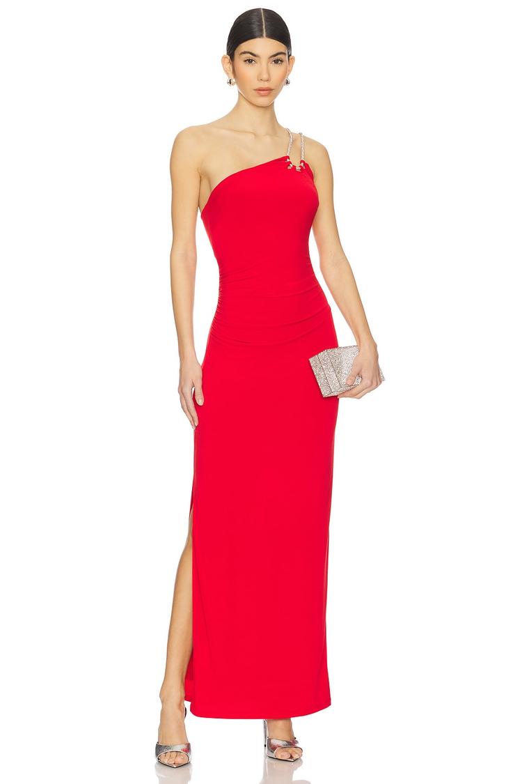 A striking red column gown crafted from a midweight polyester-spandex jersey blend offers a sleek, fitted silhouette perfect for formal evenings and cocktail occasions. The asymmetric neckline features a one-shoulder strap adorned with gemstone embellishments, adding a touch of sophisticated sparkle. This maxi-length dress includes a concealed side zipper with hook and eye closure and a tasteful side slit for ease and allure. Ideal for date nights or upscale events, its clean hemline and elegant design ensure a timeless, sexy appeal.