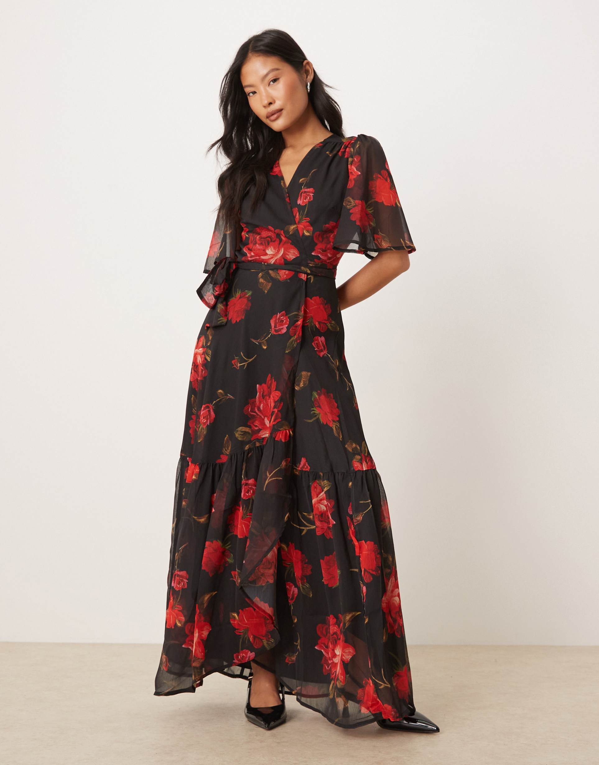 HOPE & IVY PETITE WRAP FRONT MAXI DRESS IN BLACK AND RED FLORAL