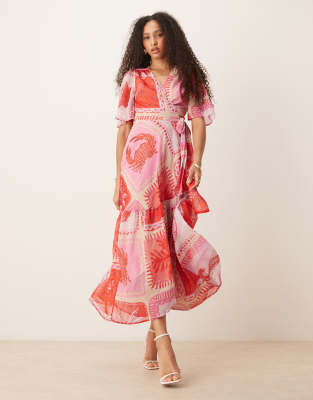 HOPE & IVY FLUTTER SLEEVE MAXI WRAP DRESS IN PINK BEACH PRINT
