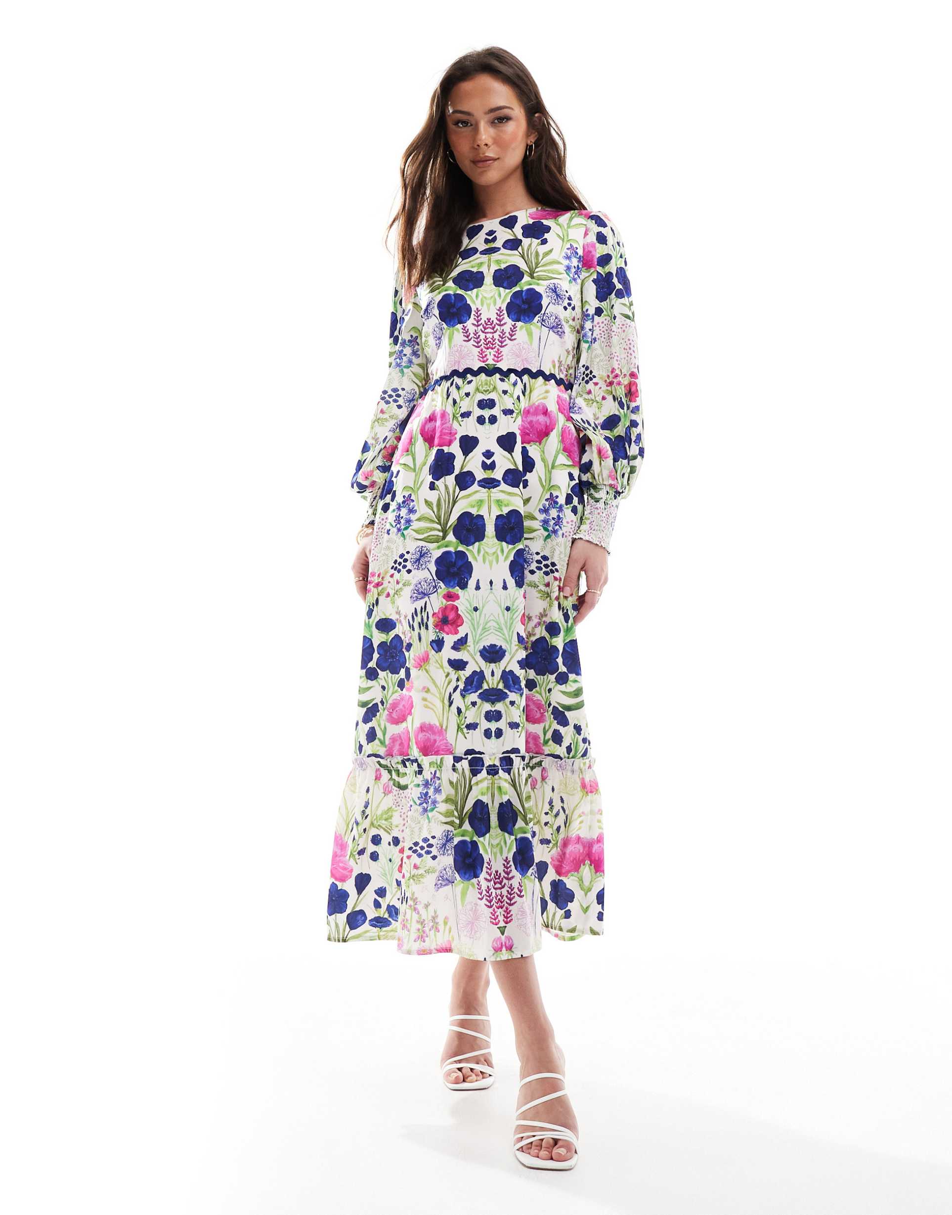 Move through sunlit days in the Hope & Ivy high-neck maxi dress, a vibrant floral statement built for all-day ease. Crafted in plain-woven polyester, it falls in a soft, regular-fit silhouette to a graceful maxi length, with long voluminous sleeves and a refined high neckline. A dainty keyhole at the back is finished with a feminine bow-tie detail, making it endlessly chic from day to night. All-over floral print in bright blues, pinks, purples and greens pops against a clean white base. Style with sandals for brunch, or elevate with heeled sandals and a lightweight cardigan for vacation evenings.