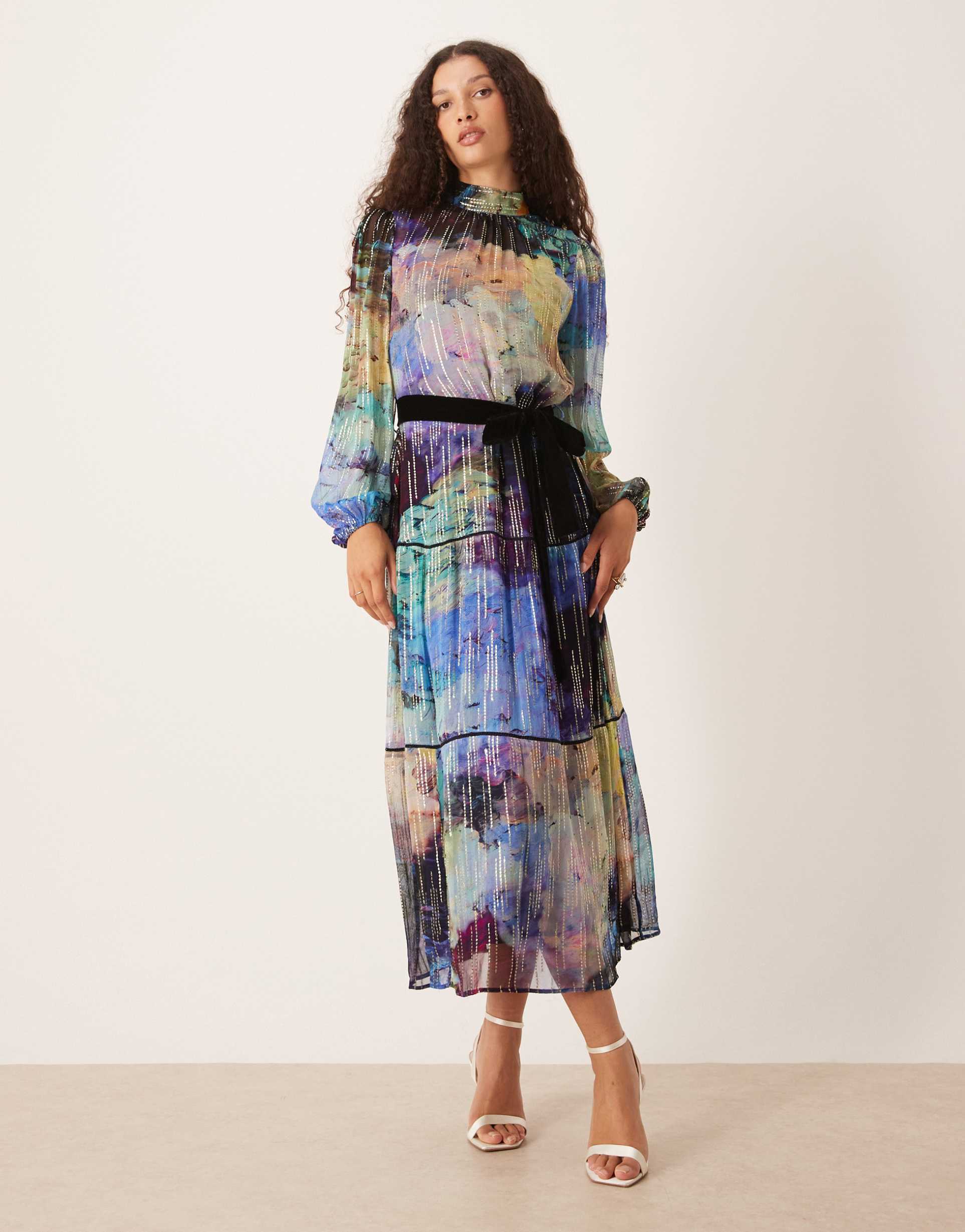 HOPE & IVY HIGH NECK MIDI DRESS WITH TIE WAIST IN BLUE PRINT