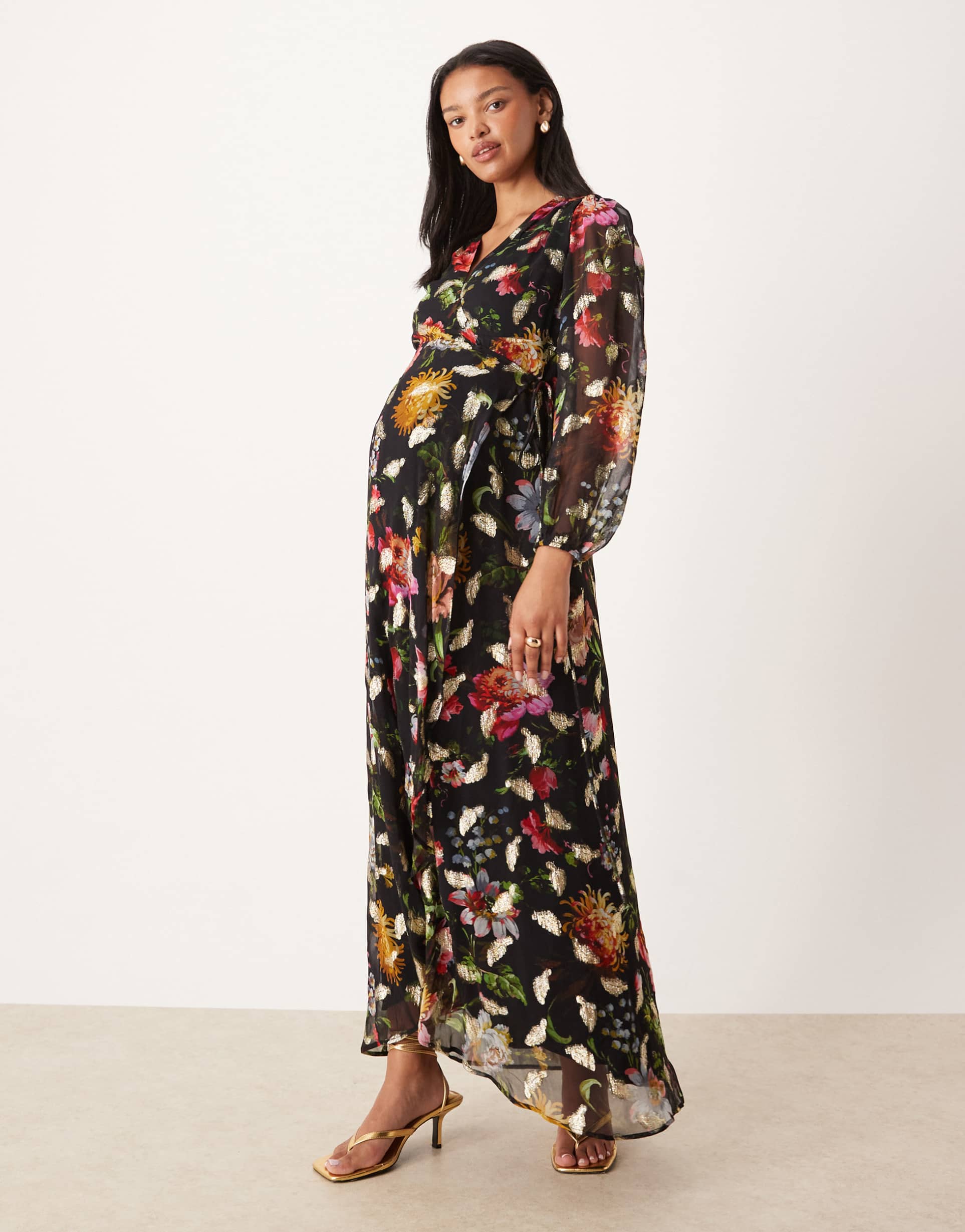 HOPE & IVY MATERNITY WRAP FRONT MAXI DRESS IN BLACK FLORAL WITH GOLD FLECKS
