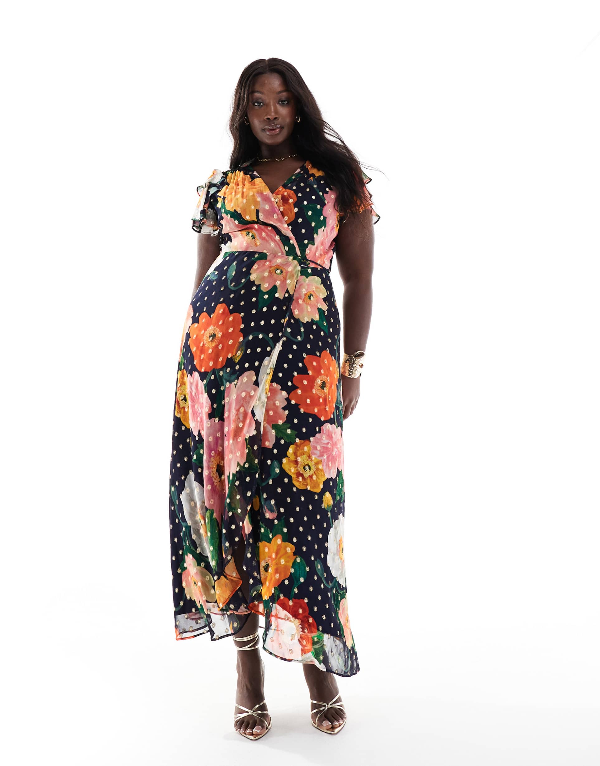 A flutter sleeve maxi wrap dress in a matte navy base is elevated with a vibrant all-over floral and polka dot pattern in bright orange, pink, green, and white. The tie waist defines the silhouette in a regular fit that flows elegantly to the clean hemline, perfect for spring and summer occasions. Metallic details shimmer subtly throughout the plain-woven polyester fabric, adding a sophisticated edge to this romantic and elegant style. Ideal for cocktail parties, date nights, and wedding guest events, this plus size dress blends comfort and standout design with ease.