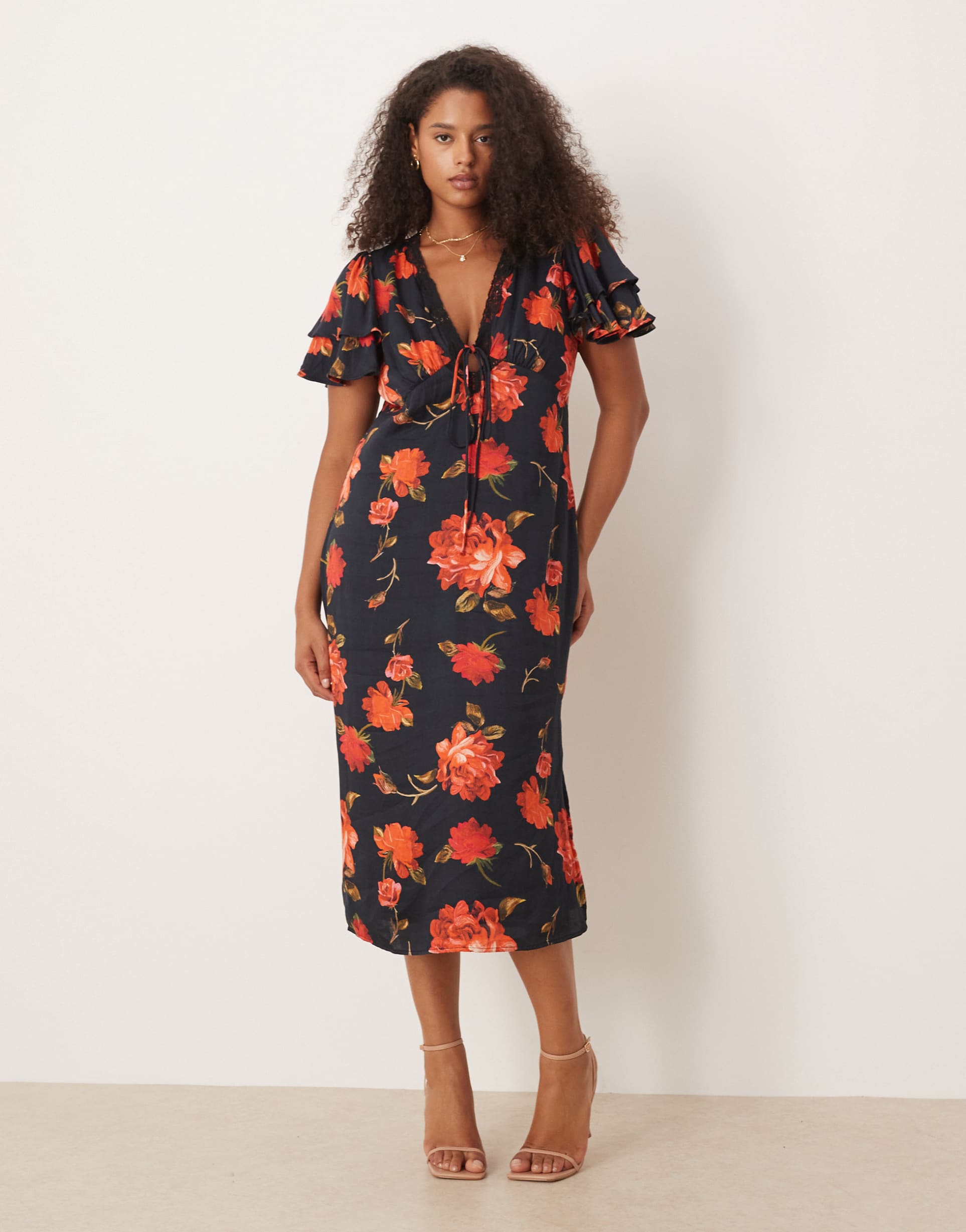 HOPE & IVY PLUS V-NECK RUFFLE SLEEVE MIDI TEA DRESS IN BLACK AND RED FLORAL