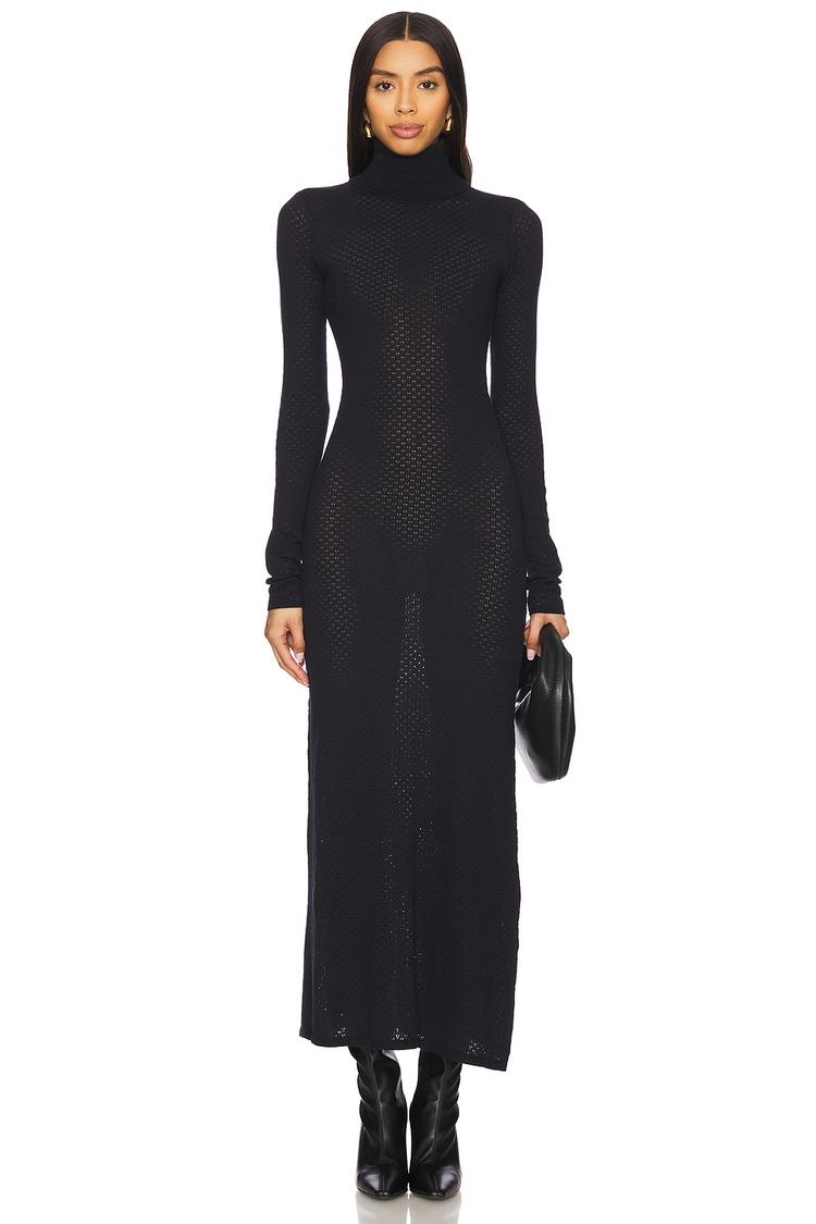 A sleek column silhouette in matte black with a fitted, long-sleeve design, this maxi dress features a foldover turtleneck and semi-sheer open knit fabric that adds subtle allure. Crafted from a cotton, nylon, and wool blend, it offers cozy warmth ideal for autumn and winter. Its clean hemline and minimalist style make it perfect for date nights, casual outings, or sophisticated evening events where understated elegance is key.