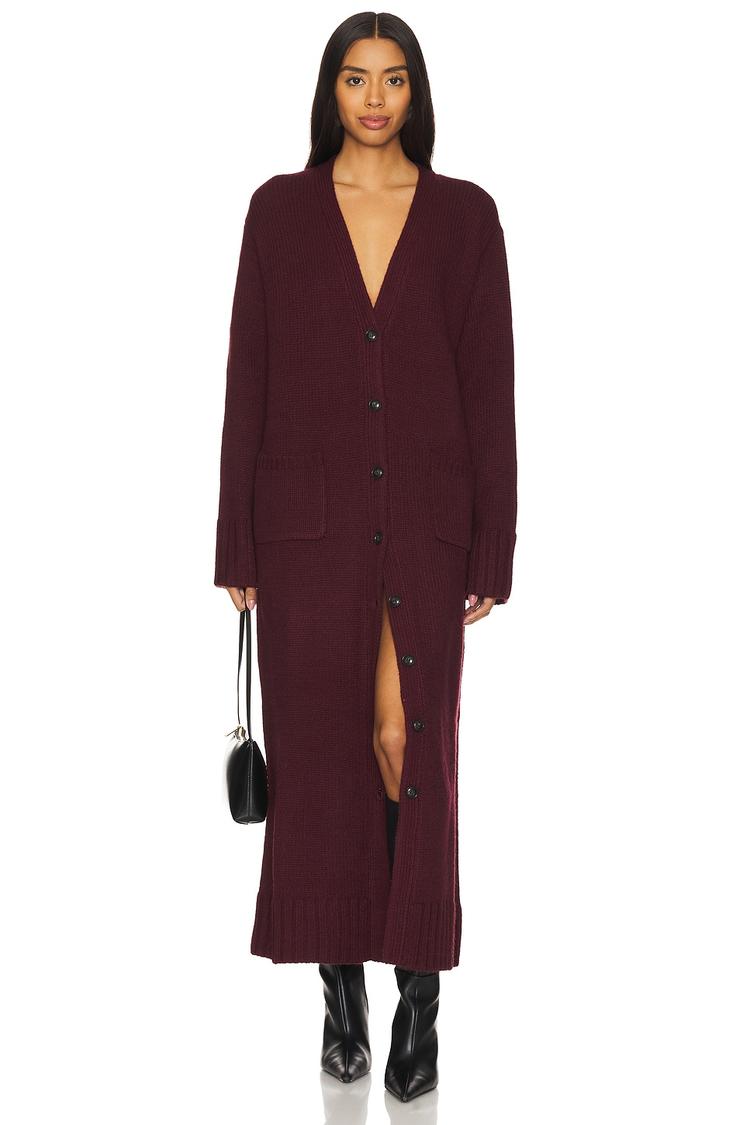 A deep burgundy heavyweight knit creates a relaxed maxi sweater dress that blends cozy warmth with timeless elegance. Featuring a V-neckline and long regular sleeves, this button-front dress offers both style and comfort for cooler seasons. Functional front button pockets add practicality, while the clean hemline complements its classic silhouette. Ideal for casual outings, workwear, or date nights, this versatile piece crafted from acrylic, nylon, and wool delivers enduring style with a minimalist yet polished vibe.