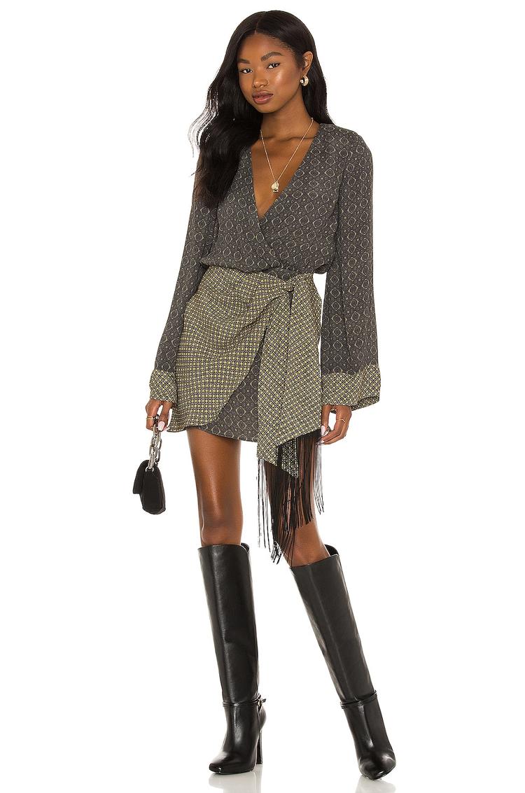 Lightweight challis fabric and a knotted overlay with fringe trim define this mini wrap dress’s bohemian allure. Featuring a deep V-neck and flared long sleeves, its regular fit skims the body effortlessly. The asymmetric hemline adds a modern twist to the geometric print in matte black and beige hues. Ideal for date nights, girls' nights out, or casual chic occasions, this versatile mini dress balances comfort and style with pull-on styling and lightly padded shoulders for subtle structure.