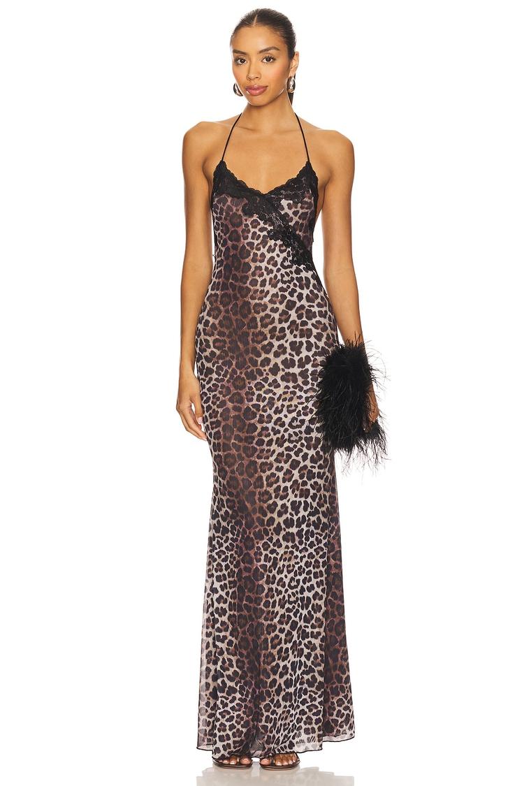 A sultry silhouette defined by a sleek slip dress with a maxi length and a V-neckline, this halter-style gown features delicate lace trim along its borders and back, enhancing its sexy appeal. Crafted from midweight mesh fabric with polyester and nylon blends, it offers a comfortable slim fit that skims the body beautifully. The all-over animal print in matte brown and black brings a bold, modern edge, making it ideal for cocktail parties, night outs, and date nights. The tie-back closure adds an adjustable, feminine touch to this standout piece.