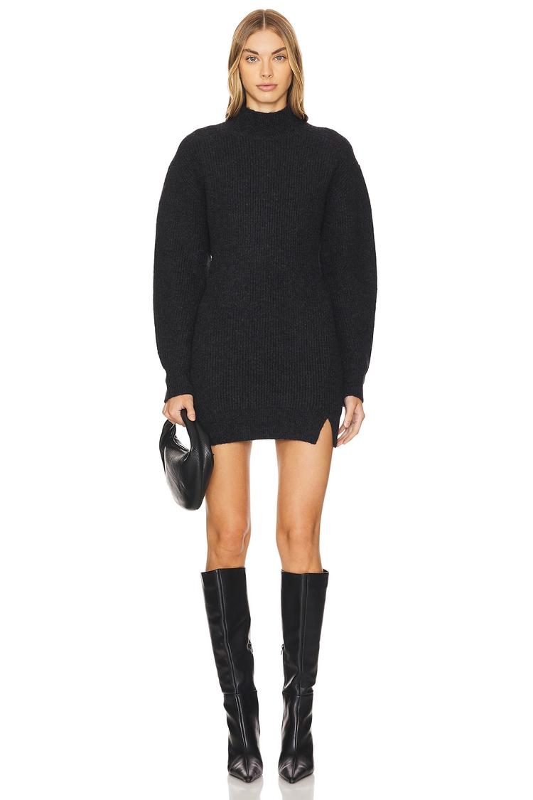 A cozy matte black knit with a chic mock neck and long sleeves defines this mini sweater dress. Crafted from a luxurious blend of wool, alpaca, and polyamide, it promises warmth and softness, perfect for autumn and winter wear. The notched hem adds a subtle modern edge to its minimalist silhouette. Ideal for casual outings, brunches, or intimate date nights, this regular-fit pullover dress combines comfort with sleek style effortlessly.