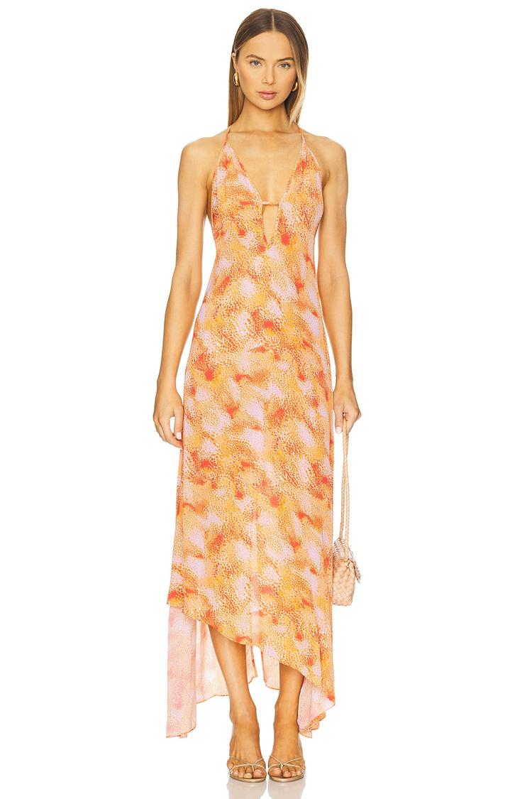 Sun-drenched days and sultry evenings come alive in this peach-hued maxi slip dress crafted from lightweight viscose crepe. Its plunging neckline and slim fit beautifully accentuate the silhouette, while the criss-cross back straps add a modern touch of allure. The abstract all-over pattern in muted pink and white creates a soft visual texture, complemented by the asymmetric hemline that flows elegantly. Ideal for spring and summer occasions, this dress is a versatile choice for cocktail parties, date nights, or stylish night outs.